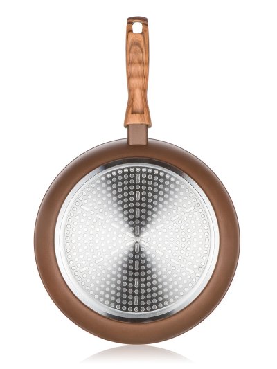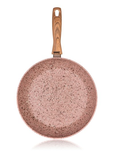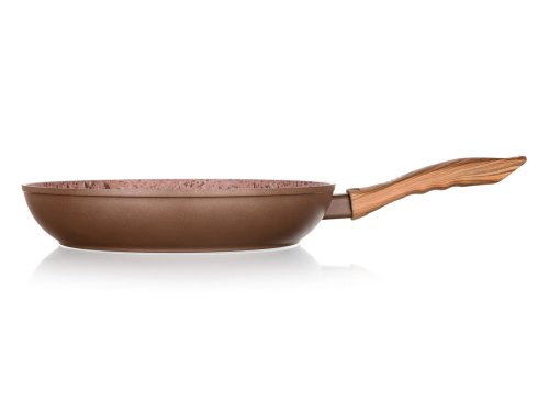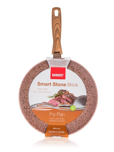 Pánev s nepřilnavým povrchem SMART STONE Brick. Kovaná hliníková pánev SMART STONE BRICK s bakelitovou rukojetí se soft touch povrchovou úpravou v imitaci přírodního dřeva. Pánev má dvouvrstvý vnitřní nepřilnavý povrch ve struktuře říčního kamene, indukční dno a je opatřena vnějším žáruvzdorným nástřikem.