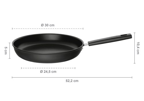 Pánev z hliníku pro náročné použití. Má nejodolnější povrch Hardtec Superior+ s vynikající nepřilnavostí a velkou odolností. Moderní černý design je doplněný držadlem z bakelitu, které zůstává při vaření chladné a dobře se drží. Výška: 105 mm, délka: 525 mm, šířka: 320 mm, hmotnost: 1750 g.