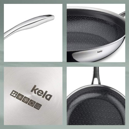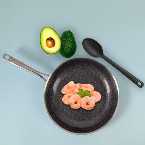 Ochranná vrstva odolná proti poškrábání umožňuje použití kovového kuchyňského náčiní bez obav z poškození. Třívrstvé tělo nádobí kombinuje nerezovou ocel s hliníkovým jádrem pro optimální rozložení tepla až do okrajů nádoby.