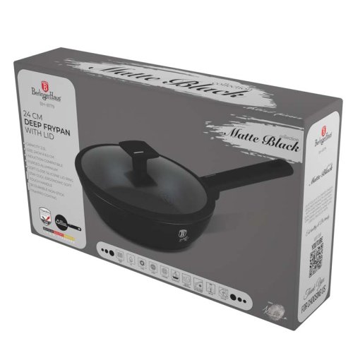 Tato hluboká pánev s poklicí je vyrobena z kovaného hliníku s nepřilnavou vrstvou TitanPro, která zajišťuje vysokou kvalitu a odolnost. Pánev má průměr 24 cm, výšku 6,5 cm a objem 2,3 litru. Matná černá barva a minimalistický styl dodávají pánvi moderní vzhled. Ergonomická měkká rukojeť a úchyt poklice zajišťují pohodlné a bezpečné používání. Poklice je vyrobena z tvrzeného skla se silikonovým systémem Soft Close odolným proti teplu a otvorem na odvod páry.