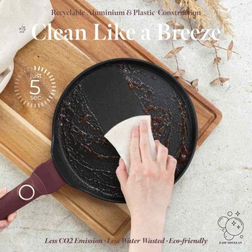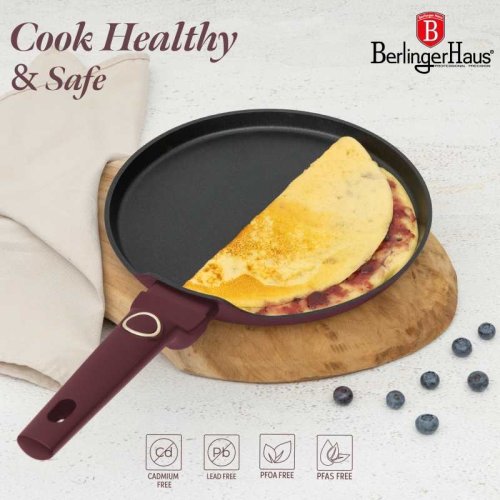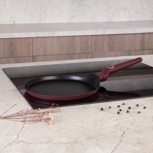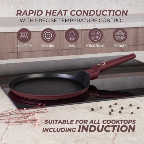Pánev na palačinky s titanovým povrchem v matném červeném bordeaux designu Leonardo Collection. Moderní minimalistický design pánve vás jistě zaujme hned na první pohled. Matný bordeaux povrch pánve je navíc velmi praktický při dlouhodobém používání. Vnitřní vrstva je potažena 3vrstvým titanovým povrchem, který je charakteristický svou dokonalou nepřilnavostí. Připravované pokrmy se tak nepřipalují a díky tomu se pánev velmi snadno čistí. Zároveň je vhodný pro zdravé vaření s minimem tuku nebo oleje, v závislosti na použitých surovinách klidně i bez jedinné kapky tuku. Titanový povrch, stejně jako ostatní použité materiály, neobsahují žádné škodlivé látky, vaření je tak zcela zdravé a hygienické. Zesílené Turbo indukční dno z nerezové oceli je kompatibilní se všemi druhy varných desek a spolehlivě funguje také na indukci. Jistě oceníte tepelně izolovanou rukojeť, která se při vaření nezahřívá a zůstává stále chladná. Pánev Leonardo je vhodná pro každodenní vaření, dušení i smažení, perfektně bude vypadat i při servírování hotových jídel přímo na váš stůl. <BR><BR>- vnitřní i vnější vrstva neobsahují žádné škodliviny, výsledné pokrmy tak neztrácí vařením svoje vitamíny<BR>- jádro pánve z kovaného hliníku vyniká vysokou stabilitou a perfektní tepelnou vodivostí, takže se nejen rychle a rovnoměrně zahřeje po celém povrchu, velmi snadno také teplotu při vaření udržuje<BR>- zesílené nerezové Turbo indukční dno pro maximální efektivitu přípravy pokrmu<BR>- ergonomicky tvarovaná rukojeť s protiskluzovou měkčenou úpravou<BR>- tepelně odolná rukojeť, po celou dobu vaření je chladná a nepálí<BR>- vhodná na všechny druhy sporáků i na indukci<BR>- vhodná také k zapékání v troubě do maximální teploty 160°C<BR>- díky nadstandartním nepřilnavým vlastnostem titanového povrchu je čištění pánve rychlé a nenáročné, stačí omýt teplou vodou a houbičkou<BR>- lze mýt také v myčce na nádobí<BR>- ideální pro každodenní vaření, dušení a smažení jakýchkoliv pokrmů<BR>- vysoce atraktivní moderní design s unikátní vnější barvou<BR>- pánev je díky svému designu vhodná i pro servírování hotových pokrmů přímo na stůl<BR><BR>- rozměry: průměr horního okraje 25 x výška 1,5 cm<BR>- barva: červená bordeaux<BR>- kolekce: Leonardo Collection<BR>- trouba: 160°C<BR>- indukce: ano<BR>- sklokeramika: ano<BR>- plyn: ano<BR>- elektřina: ano<BR>- povrch: titanový