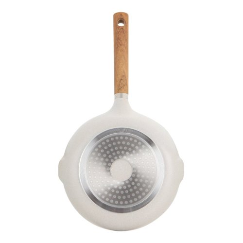 • Pánev 24 cm. • Vyrobeno z litého hliníku pro skvělé udržení tepla. • Krémové provedení se zlatými a bílými puntíky. • Dot indukční základna, vhodná pro všechny varné desky. • Ergonomická dřevěná rukojeť s měkkým dotykem.• Snadné čištění. Přirozeně vám přináší pánev o průměru 24 cm, která optimálně udržuje teplo pro pomalé a šetrné vaření jídla díky vysoce kvalitnímu litému hliníku, ze kterého je vyrobena. Praktická pánev se dvěma nalévacími hubicemi po stranách pro nalévání krémů nebo tekutin bez rozlití. Manipulujte s ním bezpečně díky ergonomické dřevěné rukojeti měkké na dotek pro dokonalé uchopení. Užijte si kolekci navrženou s tečkovanou indukční základnou vhodnou pro všechny varné desky na trhu a její krémová barva s jemnými zlatými a bílými tečkami, která dodá vaší kuchyni teplý vzduch. Snadno se čistí, pro prodloužení životnosti výrobku se doporučuje ruční mytí.