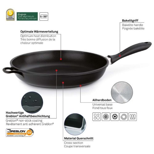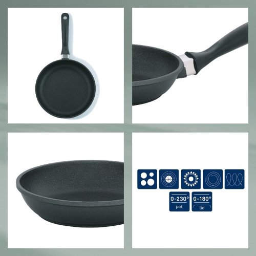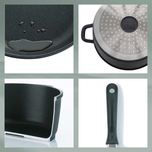 Kerros série je vyrobena ze silného litého hliníku s tloušťkou stěny 5 mm. Zvláštní znak kvality: 6 hvězdičkový nepřilnavý povrch GREBLON C3+. 3-vrstvá, keramikou plněná teflonová vrstva se vyznačuje vynikajícím anti-adhezním efektem, vysokou odolností proti poškrábání a velmi dobrou odolností proti oděru.