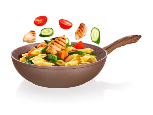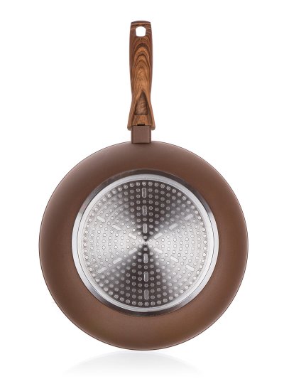Kovaná hliníková WOK pánev SMART STONE BRICK, s bakelitovou rukojetí se soft touch povrchovou úpravou, v imitaci přírodního dřeva. Pánev má dvouvrstvý vnitřní nepřilnavý povrch ve struktuře říčního kamene, indukční dno a je opatřena vnějším žáruvzdorným nástřikem.