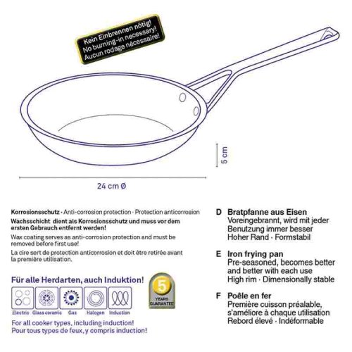 Pánev se nemusí vypalovat! Robustní pánev je již předem vypálená! Barva pánve je výsledkem vypalování.