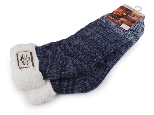 Maxi teplé ponožky [s copánkovým vzorem] nedají zimě šanci. Jsou heboučké, z vrchní strany pletené, uvnitř je teplá chlupatá podšívka, která věrně imituje vlnu. [Na bocích jsou ozdobené textilním štítkem.] Na chodidle mají protiskluzové gumové plošky, které brání uklouznutí, můžete je používat i jako domácí obuv. Široký měkký lem je příjemný na nošení.