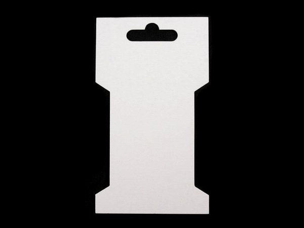 Karta s výsekem pro zavěšení široká 6,6 cm, dlouhá 11,5 cm. Nahoře má výsek k zavěšení. Vykrojení na stranách můžete využít k rozměření a navinutí stuh, paspulek, šikmých proužků apod. Šířka úzkého středu je 5 cm. Karta je vhodná pro vystavení gumiček a sponek. Je vyrobená z tvrdého papíru.
