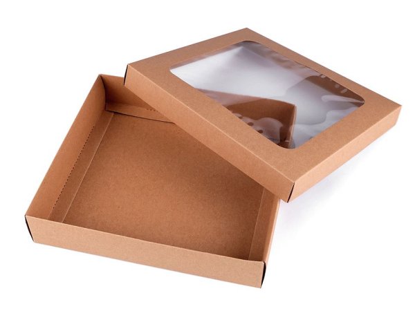 Papírová krabice má výřez ve víku z průhledné fólie.