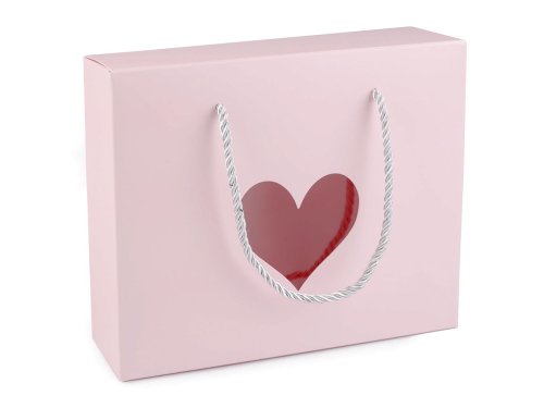 Papírová krabice s průhledem srdce má ucha z lesklé kroucené šňůry. Slouží jako taška s uzavíráním, bez uch ji můžete použít jako klasickou dárkovou krabici. Výřez srdce je zespodu podlepený průhlednou fólií. Krabici využijete na balení dárků, šátků, kosmetiky apod. Krabici dodáváme v rozloženém stavu (29 x 33 cm). Složíte si ji jednoduše podle vyznačených ohýbacích krajů. Součástí jsou i 2 ucha na vložení do otvorů. Rozměr průhledu je 8 x 7,5 cm.