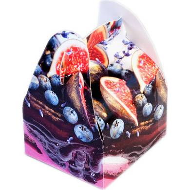 "Taštička z pevného papíru s barevným potiskem, vhodná na přenášení zákusků, cukroví, koláčů a podobného pečiva. Rozměry: 11 x 10 cm ".