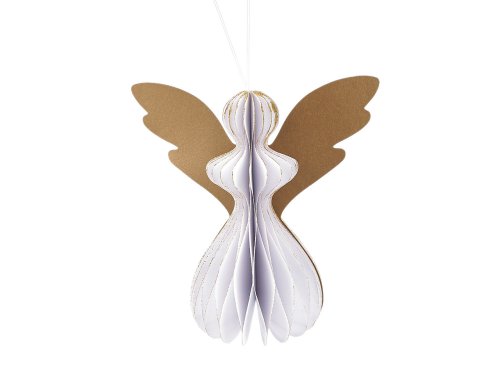 Závěsný anděl je vyrobený z plástvového papíru, který při roztažení vytváří efekt připomínající včelí plástve. Anděl má poutko na zavěšení, ale díky široké základně i výborně stojí. Tvar anděla skvěle drží díky magnetům, které jsou uvnitř. Hrany papíru zdobí třpytivé glitry.