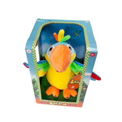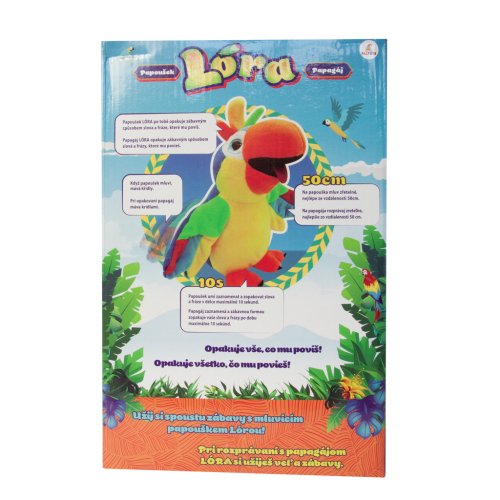 Papoušek LÓRA po Vás zábavným hlasem zopakuje vše co mu řeknete. Maximální délka jednotlivých nahrávek je 10 vteřin. Při opakování legračně mává křídly. Baterie: 3xAAA, nejsou součástí balení. Pro děti od 3let.