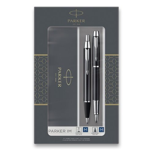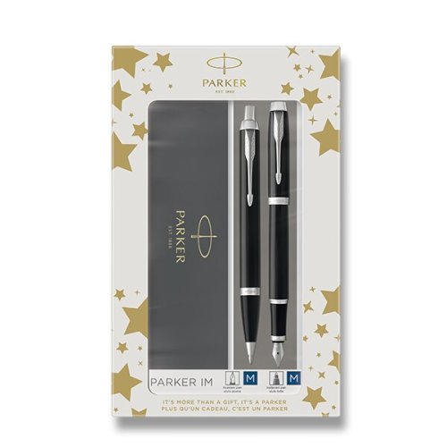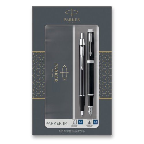 Plnicí pero:, * nasazovací víčko, * hrot M, * dvoukanálkový systém zásobování hrotu inkoustem, * přizpůsobeno výhradně k používání inkoustových bombiček Quink nebo konvertoru (není součástí balení), Kuličkové pero (propiska):, * stiskací mechanismus, * dodáváno s modrou náplní, Vyrobeno ve Francii. Dodáváno v dárkové kazetě. (Podoba balení dle skladové dostupnosti)., TIP: K plnicímu peru byste mohli využít konvertory Parker s lahvičkovým inkoustem nebo inkoustové bombičky Quink., TIP: Kupte si rovnou i náhradní náplň Parker do kuličkového pera., TIP: Jak vyčistit plnicí pero?, Parker IM je ideální partner s neomezenými možnostmi. Je elegantní i vysoce profesionální a spolehlivý. Nabízí odolný hrot z ušlechtilé nerezové oceli, širokou paletu provedení, inspirovaných tradicí značky Parker, uživatelské pohodlí i maximální výkonnost., JAK SE LIŠÍ HROTY F A M?, F - Slabý hrot (Fine) - Vhodný pro běžné psaní a poznámky. Mírný tlak vytváří jemnou linku. Velmi oblíbený, vhodný pro uživatele se standardním rukopisem., M - Střední hrot (Medium) - Průměrný tlak a šíře linky. Vhodný pro uživatele, kteří mají rádi maličko silnější linku.