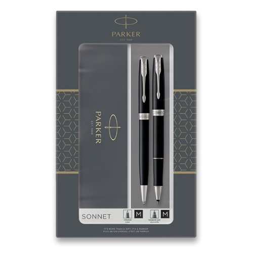 Roller:, * nasazovací víčko, * standardní náplň Quink pro rollery - černá, Kuličkové pero (propiska):, * otočný mechanismus, * dodáváno s černou náplní, Vyrobeno ve Francii. Dodáváno v dárkové kazetě. (Podoba balení dle skladové dostupnosti)., TIP: K rolleru byste mohli využít náhradní náplň Parker F nebo M., TIP: Kupte si rovnou i náhradní náplň Parker do kuličkového pera., Nadčasová elegance modelu Sonnet, jeho vytříbený styl i rozmanité povrchové úpravy skvěle navazují na designérskou tradici značky Parker. Sonnet je dokonalým zosobněním všeho, co, Parker umí nejlépe – mistrovského zpracování hrotů z 18karátového zlata, ideálního rozložení hmotnosti pera i pečlivého sestavení jednotlivých, celkem 17 různých dílů. Modelová, řada Sonnet je skutečně nadčasová…a zároveň vždy aktuální.