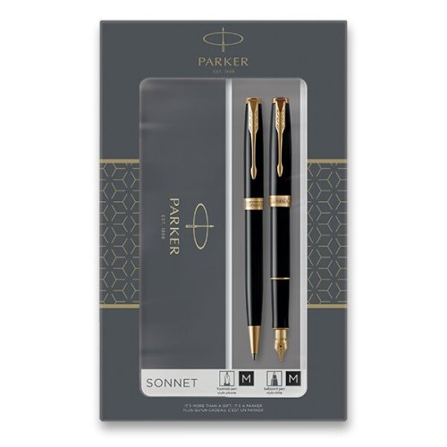 Plnicí pero:, * nasazovací víčko, * hrot M, * standardní konvertor s pístem pro plnění pera inkoustem Quink z lahvičky, * možnost používat i inkoustové bombičky Quink, Kuličkové pero (propiska):, * otočný mechanismus, * dodáváno s černou náplní, Vyrobeno ve Francii. Dodáváno v dárkové kazetě. (Podoba balení dle skladové dostupnosti)., TIP: K plnicímu peru byste mohli využít konvertory Parker s lahvičkovým inkoustem nebo inkoustové bombičky Quink., TIP: Jak vyčistit plnicí pero?, TIP: Kupte si rovnou i náhradní náplň Parker do kuličkového pera., Nadčasová elegance modelu Sonnet, jeho vytříbený styl i rozmanité povrchové úpravy skvěle navazují na designérskou tradici značky Parker. Sonnet je dokonalým zosobněním všeho, co, Parker umí nejlépe – mistrovského zpracování hrotů z 18karátového zlata, ideálního rozložení hmotnosti pera i pečlivého sestavení jednotlivých, celkem 17 různých dílů. Modelová, řada Sonnet je skutečně nadčasová…a zároveň vždy aktuální.,