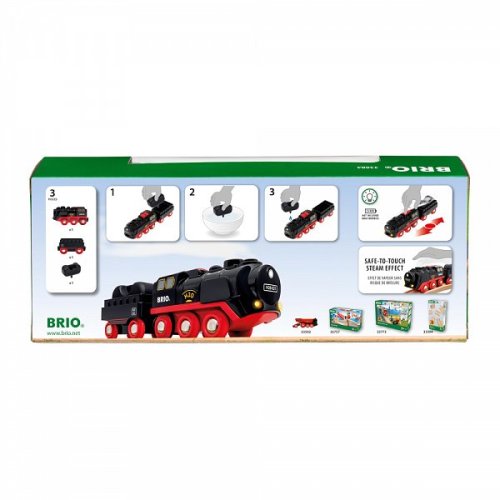 Parní lokomotiva BRIO s realistickými parními efekty, světlem, nákladním vozem a nákladem. Po stisknutí červených tlačítek na horní části lokomotivy se vláček rozjede dopředu nebo vzad. Sledujte, jak z komína vychází bezpečná pára na dotek. Vodu do lokomotivy doplníte nákladem z nákladního vozu, který zároveň slouží jako plnící díl. Vyrobeno z vysoce kvalitních plastů a jemných kovových detailů. Hračky BRIO jsou vysoce kvalitní, vytvořené odborníky s důrazem na bezpečnost součástek. Počet dílků: 3. Baterie: 2x AAA (nejsou součástí balení). Rozměr: 181 x 37 x 51 mm. Rozměr balení: 25 x 10 x 5 cm. Věk: 3+. Video: https://vimeo.com/502149708