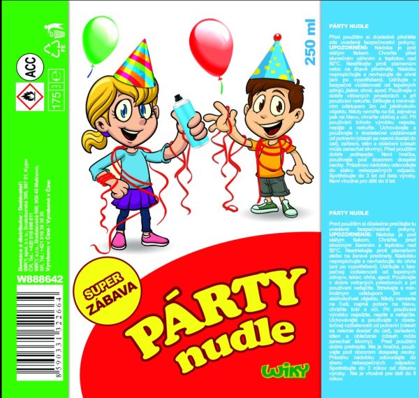 Nudle ve spreji, neboli špagety ve spreji nesmí chybět na žádné zábavě a párty. Vyberte oblíbenou barvu a rozjeďte to! Při stisku spouště se ze spreje vyloučí tenký proužek barevné pěny, která okamžitě schne. Po zaschnutí lze sebrat větší kusy ze země. Ideální je použití na venkovních párty akcích. Na některých textiliích může zanechávat stopy. Prosím dodržujte bezpečnostní pokyny na lahvičce. Objem 250ml. Rozměry výrobku 17cm. Vhodné pro děti od 8 let.