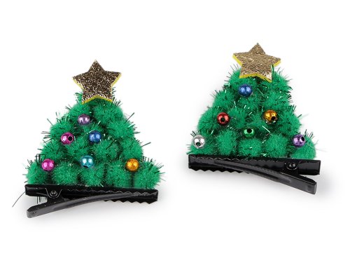 Sponky s vánočním stromečkem potěší malé i velké slečny. Malé je ocení k dozdobení roztomilého dětského účesu, pro velké slečny se stanou nepostradatelným doplňkem vánočních večírků. Jsou ozdobené metalickými korálky a zlatou hvězdou, jsou sestavené z chlupatých bambulek s lurexem. Spony mají zoubky, v účesu perfektně drží. Nemusí se nosit jen ve vlasech, můžete si je ozdobně připnout na tašku, jako zimní dekoraci apod.