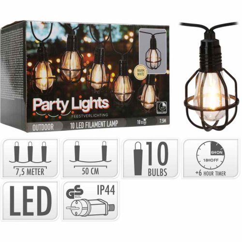 světelný řetěz s 10 žárovkami, s černým kulatým krytem, každá žárovka s 1 vláknem, každé vlákno s 11 teplými bílými led, plastová žárovka, 137 lumenů, kabel v černé barvě, přívodní kabel: 3m, vzdálenost žárovek: 50cm, délka bez přívodního kabelu 4,5m, kulatý gumový kabel, adaptér ip44, s časovačem 31v 3,6w