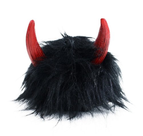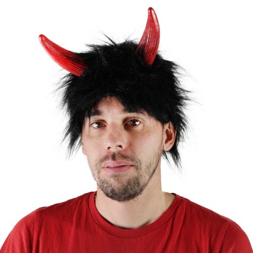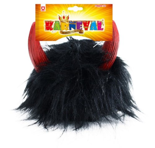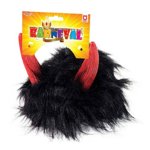 Karnevalová paruka v motivu čerta. Paruka má černé vlasy, krátkou ofinou a je dekorována čertími červenými růžky.