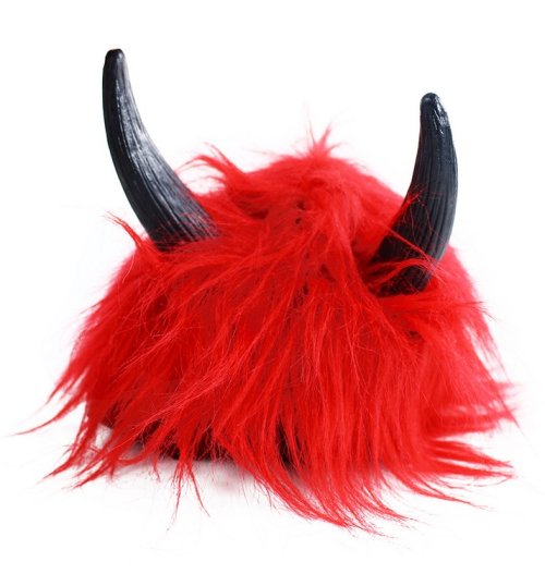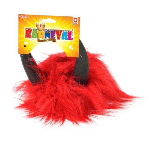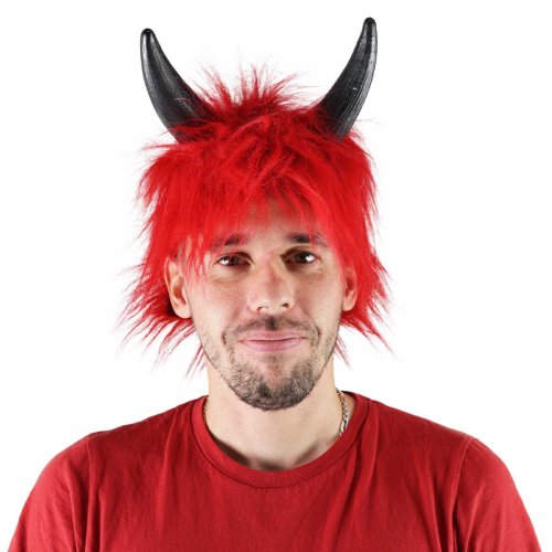 Karnevalová paruka v motivu ďábla. Paruka má krátké červené vlasy, krátkou ofinu a je dekorována rohy.