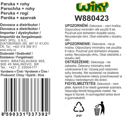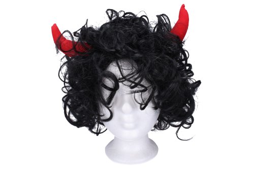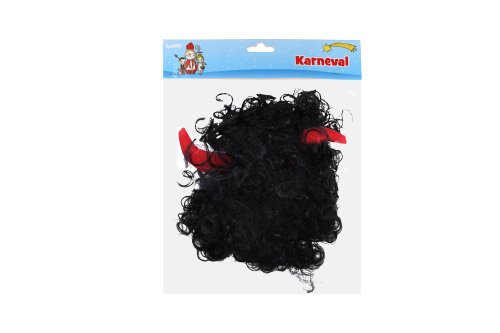 Paruká má černé vlasy a je dekorována čertími červenými růžky.