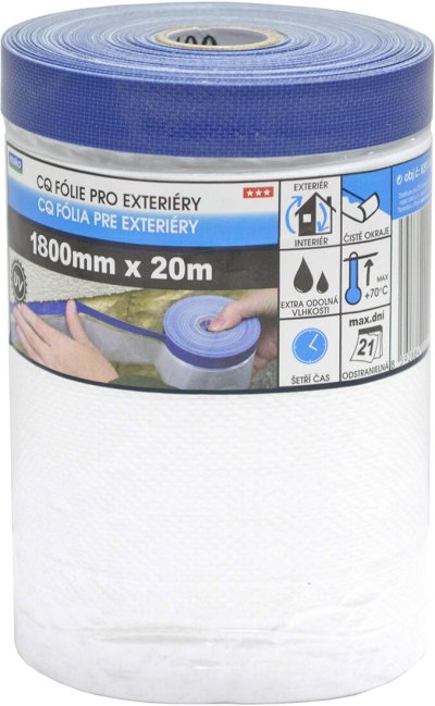 Páska krycí exteriérová 180 cm x 20 m, samolepicí, se zakrývací folií. rozměry: 180 cm x 20 m - CQ fólie pro exteriéry - nosič tkanina, lepidlo kaučuk - materiál HDPE, síla 0,010 mm - odstranitelná beze …
