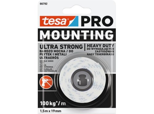 Naše nejsilnější montážní páska se hodí k bezpečnému upevnění objektů nastálo. Model tesa PRO Mounting Ultra Strong udrží objekty až 10 kg na jeden kus pásky, a dokonce vyrovná i lehkou nerovnost povrchu. Pro použití uvnitř i venku. Mimořádně silné lepidlo se hodí na dlaždice, povrchově upravené dřevo či většinu plastů, je ideální pro připevnění vizitek, lišt apod.