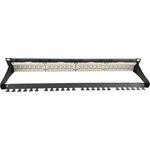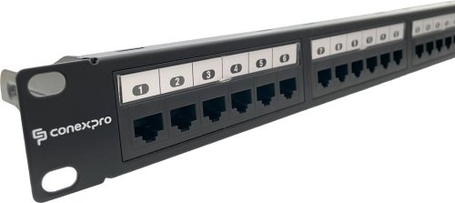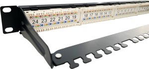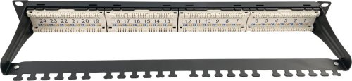 UTP patch panel bez stínění určený pro 19" datové rozvaděče s 24 porty kategorie CAT6 kombinuje spolehlivost a jednoduchou instalaci. S duálními svorkovnicemi typu 110/Krone 8p8c a kovovým provedením nabízí jednoduchou instalaci a stabilní připojení bez elektromagnetických rušení. Černá barva a výška 1U zajišťují kompaktní a estetický design. Odnímatelná vyvazovací lišta na zadní straně usnadňuje instalaci a vedení kabelů. Panel má celkovou hloubku 130 mm s lištou, 29 mm bez ní a v balení nechybí ani racková sada pro přichycení do datového rozvaděče