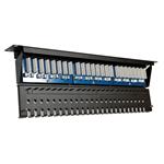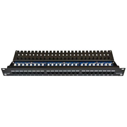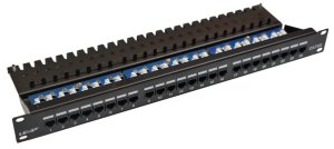 Patch panel 24 portů 1U CAT 5e UTP s pomocnou vyvazovací poličkou a horním zářezem pro 19" rozvaděče. Zářezová svorkovnice typu "KRONE".