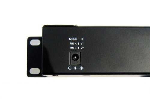 Vstup pro napájení prostřednictvím dvou 2.1mm 60V jacků, z obou vstupů je vždy zároveň napájeno všech 16 portů v režimu dle zvoleného A/B vstupu: