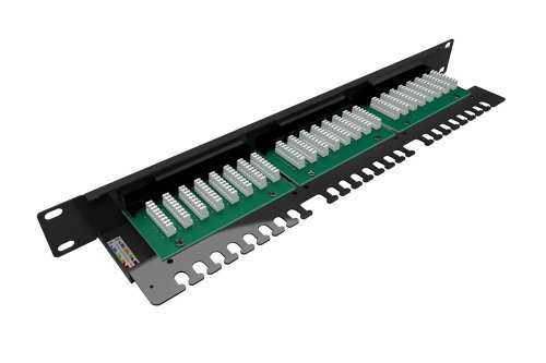 Panel je osazený celkem 24 porty RJ-45 a jeho součástí je lišta pro přehledné vyvázání a pevné uchycení kabelů přímo k tělu panelu. Instalační kabel se zakončuje do duální IDC svorkovnice typu 110/Krone s označením dle standardu T568A a T568B. Přímo na desce plošných spojů je tak barevné i číselné označení jednotlivých vodičů – liché číslo označuje polobarevný vodič a sudé plně barevný. Uvnitř balení se pak nachází 4 montážní sady M6 a 24 vyvazovacích pásek.