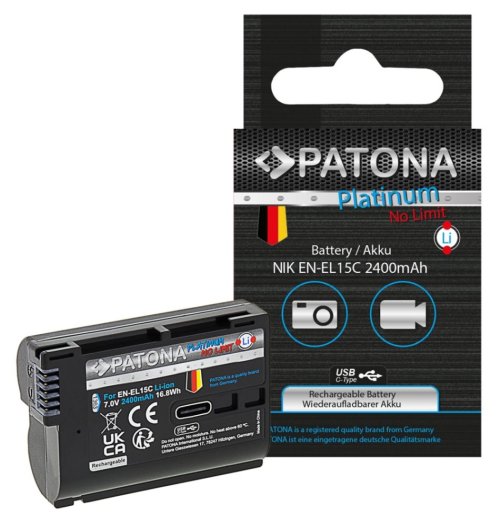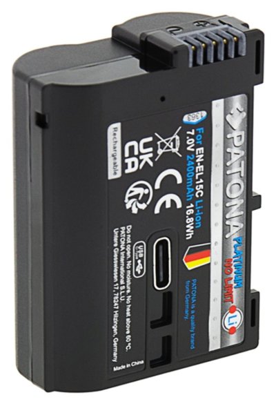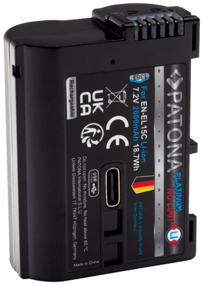 Kompatibilní baterie pro fotoaparáty Nikon. Baterie se vyznačují vysokou kvalitou, mají integrovanou ochranu proti přetížení, přebití a přehřívání. Nabíjení baterie je realizováno skrze zabudovaný konektor USB-C. Lze ji nabíjet připojením kabelu do USB-C konektoru (např. z počítače, powerbanky či nabíječkou na mobilní telefon) tak i v klasické nabíječce na Li-ion. Nabíjecí proud max. 1,2 A (vyšší vstupní proudy jsou automaticky redukovány pomocí IC ovládání baterie).