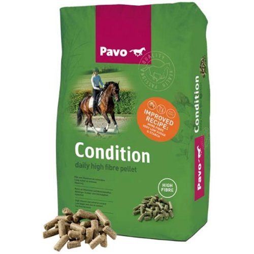 Pavo Condition je vhodné pro koně a poníky v lehké a střední zátěži, nebo pokud začínáte s tréninkem mladého koně. Pavo Condition obsahuje denní dávku minerálů a vitamínů. Účelem Pavo Condition je zajistit vašemu koni všechny živiny, které potřebuje pro lehkou a střední zátěž. Složení je pečlivě upraveno podle nejnovějších vědeckých poznatků. Pavo Condition splňuje všechny denní požadavky na obsah vitamínů a minerálních látek. Má vysoký obsah snadno stravitelné vlákniny a snížený obsah cukru a škrobu, což vede k vynikajícímu krmivu vhodnému pro koně a poníky v hobby nebo střední zátěži. Pavo Condition je bez ovsa.
