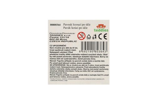 Silikonové zakončení na nohou pavouka vytváří efekt přilnavosti k hladkým povrchům, díky čemuž pavouk „leze“ po skle nebo jiných podobně hladkých plochách. Pohyb je realistický a připomíná skutečný pohyb pavouka. Rozměry balení 14 x 7 x 3 cm. Vhodné pro děti od 3 let.