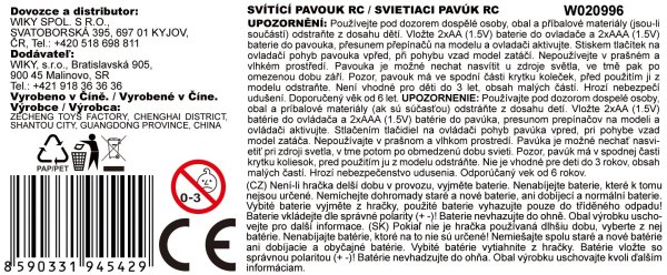 Pavouk RC na dálkové ovládání. Velikost 20 x 13 cm. Svítí ve tmě. Dosah ovladače 4 m. 2 tlačítka, pohyb dopředu a otáčení. Pavouk 2xAAA, ovladač 2xAA nejsou součástí.