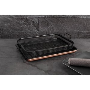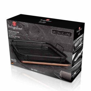 Tato sada pečicího tácu s kovovým košem je vyrobena z uhlíkové oceli s titanovou nepřilnavou vrstvou, která zajišťuje vysokou kvalitu a odolnost. Sada obsahuje kovový koš z nerezové oceli. Velikost tácu je 32,5x24,5x2 cm a velikost košíku je 30x20,5x3,5 cm. Metalická růžová zlatá barva a elegantní design dodávají této sadě moderní vzhled, který se hodí do každé kuchyně.