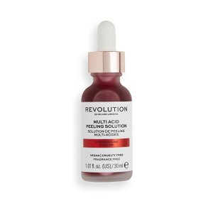Multi Acid Peeling Solution od Revolution Skincare je ošetření pleti, které exfoliuje svrchní vrstvy pokožky. Tento peelingový roztok obsahuje 30% AHA a 1,5% BHA. AHA je směsí kyseliny mléčné, kyseliny glykolové a ovocných kyselin. Pomáhají odlupovat odumřelou kůži, aby pokožka byla svěžejší a hladší. BHA je kyselina salicylová, která pomáhá proniknout peelingu hluboko do pórů, aby pleť nebyla přetížená a předešlo se praskání, takže pak vypadá hladší a zářivější.