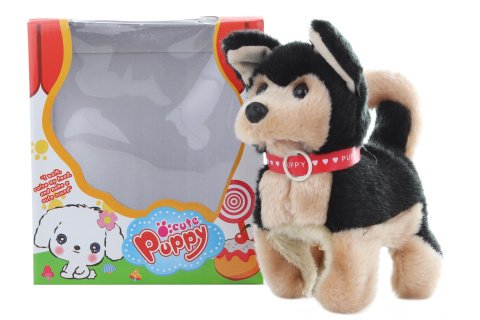 Pejsek chodící o velikosti cca 16 x 18 x 9 cm. Pejsek chodí a štěká. Napájení na 2 AA baterie (nejsou součástí). Rozměry balení cca 16 x 18 x 10 cm. Věk 3+