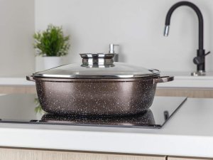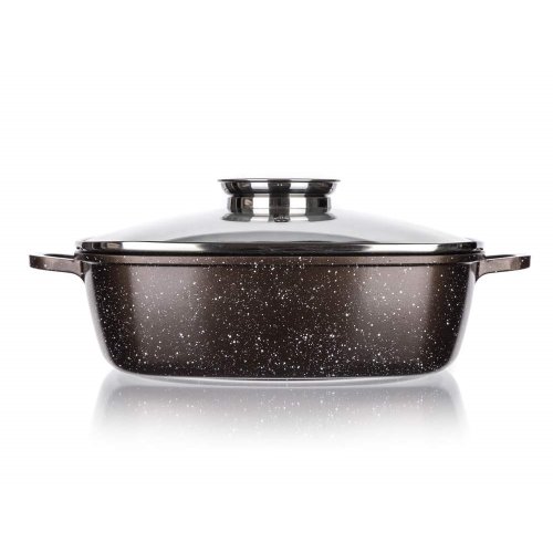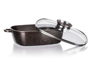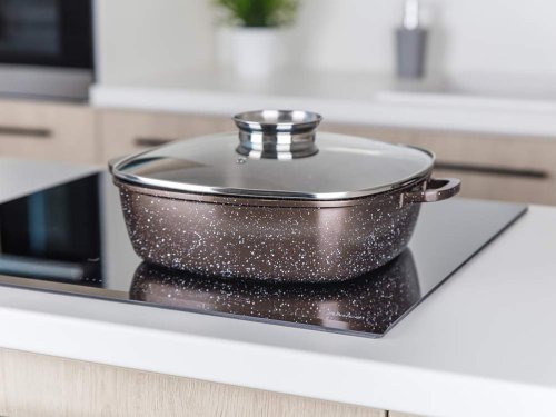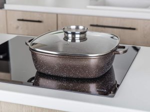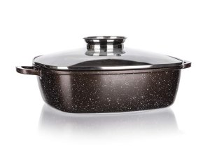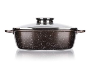 Litý hliníkový pekáč Premium Dark Brown se skleněnou poklicí s aroma knobem. Má 2vrstvý vnitřní nepřilnavý povrch v mramorové struktuře Dark Brown. Pekáč je opatřen vnějším žáruvzdorným nástřikem v mramorové strukutuře, včetně indukčního dna, které je také kryté žáruvzdorným nástřikem.