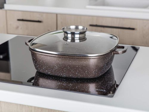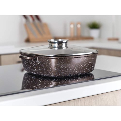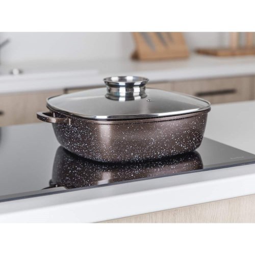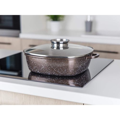 rozměry: 40 x 22 x 16,5 cm materiál: hliník tloušťka stěny: 2 mm tloušťka dna: 4,5 mm barva: hnědá dekor: Granite materiál držadel: hliník materiál poklice: sklo