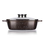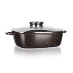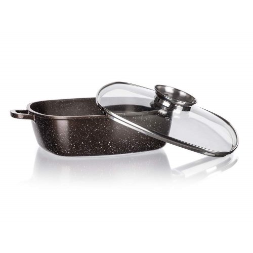 Tento litý hliníkový pekáč se pyšní nepřilnavým vnitřním povrchem a žáruvzdorným nástřikem v mramorové struktuře, který pokrývá dokonce i indukční dno. Velkou výhodou je také možnost použití do trouby, a to i se skleněnou poklicí s hliníkovým aroma knobem. Ten vám umožňuje během pečení dolévat otvorem tekutiny, aniž byste museli zvedat poklici.