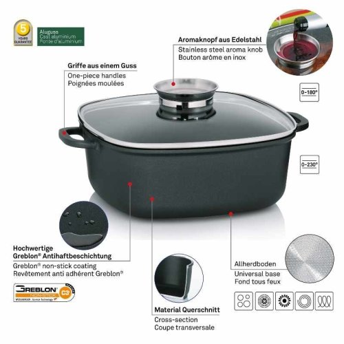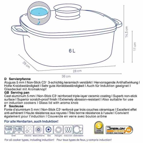 Kerros série je vyrobena ze silného litého hliníku s tloušťkou stěny 5 mm. Zvláštní znak kvality: 6 hvězdičkový nepřilnavý povrch GREBLON-C3+. 3-vrstvá, keramikou plněná teflonová vrstva se vyznačuje vynikající anti-adhezním efektem, vysokou odolností proti poškrábání a velmi dobrou odolností proti oděru.