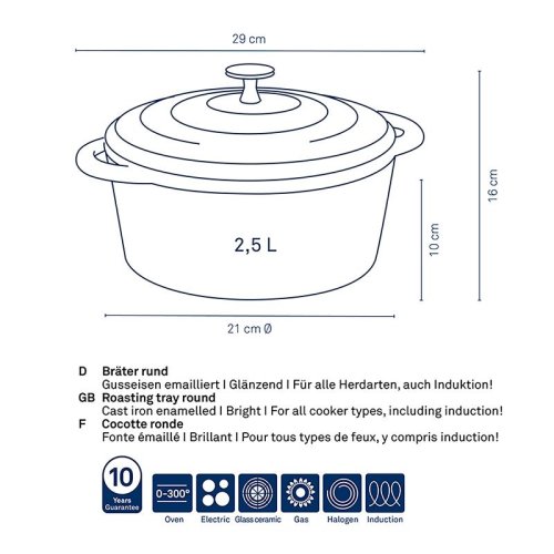 Trendy nádobí s dlouhou životností ze série kela Calido: kulatý pekáč s lesklým povrchem a poklicí má průměr 21 cm a pojme 2,5 litru. Tento krásný kulatý pekáč v šedém provedení je vyroben z litiny a má béžově smaltovaný vnitřek. Pekáč je ideální pro opékání masa (do 300°C) a pro dušená jídla, která by se měla dusit ve vlastní šťávě po dlouhou dobu. Pekáč je součástí rozsáhlého sortimentu nádobí! Litina smaltovaná světle šedá/béžová 21cm , 10cm v, 2,5L