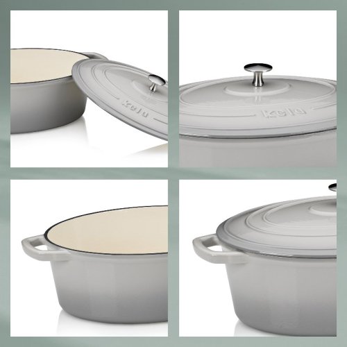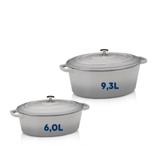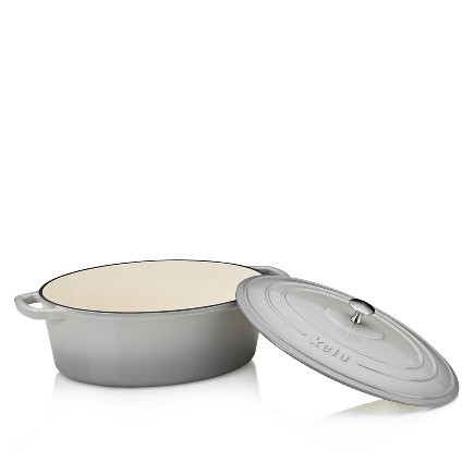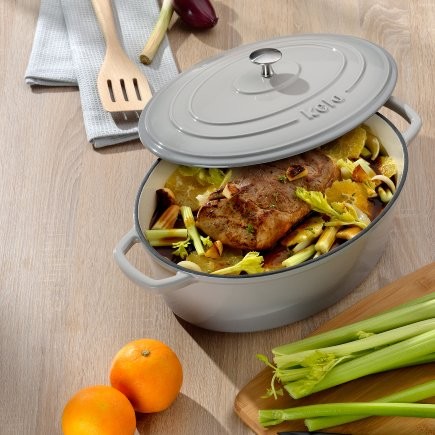 Ze série kela Calido: Oválný pekáč v šedé barvě s lesklým povrchem a víkem je dlouhý 33 cm, široký 26 cm a má objem 6,0 litrů. Celková délka včetně držadel je 42 cm. Tento šedý kastrol je vyroben z litiny a uvnitř je smaltován béžovou barvou. Pekáč je ideální pro opékání masa (do 300°C) a pro dušená jídla, která by se měla dusit ve vlastní šťávě po dlouhou dobu. Pekáč s poklicí je součástí rozsáhlého sortimentu nádobí!Smaltovaná litina světle šedá/béžová 33x26cm 12cm v, 6L