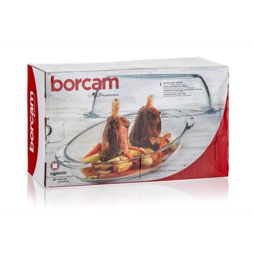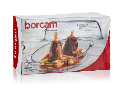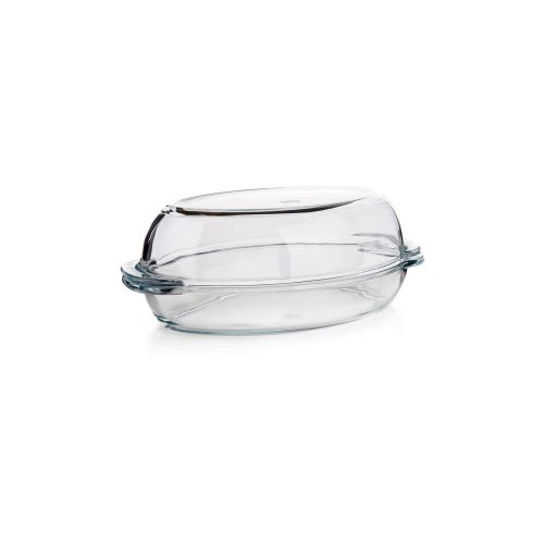 Oválný pekáč s víkem 4,6 l (nádoba 2,8 l + víko 1,8 l) je vyroben z varného boritokřemičitého skla, které je velmi odolné, jak mechanicky, tak i teplotně (teplotní rozsah -50 až / 500 st. C). Výhodou je dlouhá životnost, hygienická nezávadnost a snadná údržba (lze mýt v myčce na nádobí).
