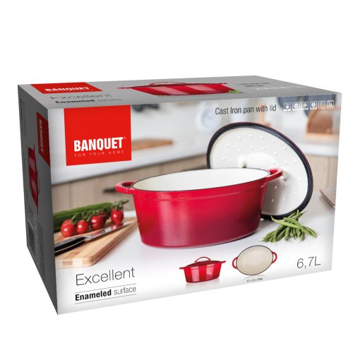 Litinový pekáč EXCELLENT s víkem, v červené barvě. Oválný pekáč s poklicí z litiny se smaltovaným povrchem je ideální pro pečení a zapékání v troubě, stejně jako k vaření, dušení či smažení na plotýnce sporáku. Litina je pro vaření a pečení naprosto ideální. Masivní materiál, který jakmile se nahřeje, vydrží dlouho a rovnoměrně rozvádí teplo, díky němuž se pokrm v litinovém pekáči upeče rovnoměrně, za kratší dobu a úsporněji. Vnitřní smaltovaný povrch je nepřilnavý, vysoce odolný proti odření a praskání a jelikož se potraviny nepřipalují, je také velmi nenáročný na údržbu. Výstupky na vnitřní straně poklice zajistí rovnoměrné odkapávání zkondenzované páry zpět do hrnce, pokrm se nevysušuje a zůstává šťavnatý. Pečení v troubě je vhodné max. do 280 st. C.