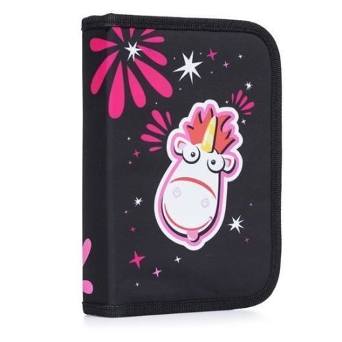 Jednopatrový školní penál se 2 chlopněmi, prázdný obsahuje 25 gumových poutek pro uchycení psacích potřeb. Na vnitřních chlopních jsou průhledné fólie pro rozvrh hodin.