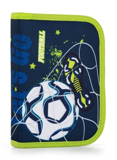 Jednopatrový školní penál s 2 chlopněmi, prázdný obsahuje 25 gumových poutek pro uchycení psacích potřeb. Na vnitřních chlopních jsou průhledné fólie pro rozvrh hodin.
