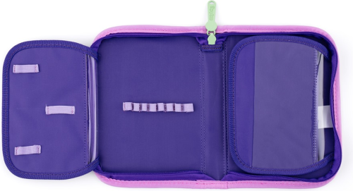 Jednopatrový školní penál s 2 chlopněmi, prázdný obsahuje 25 gumových poutek pro uchycení psacích potřeb. Na vnitřních chlopních jsou průhledné fólie pro rozvrh hodin.
